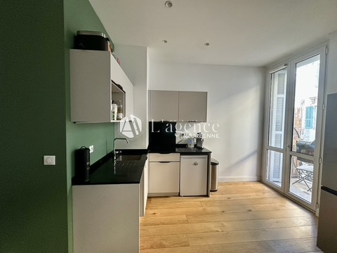 L’appartement dispose d'une cuisine moderne aménagée avec balcon, d'une grande pièce de vie de 28,70 m² et d'une grande chambre de 12,81 m² avec une salle de douche attenante donnant sur une cour intérieure au calme.